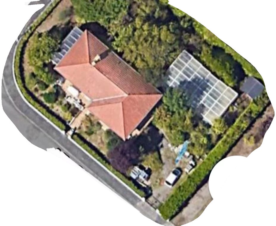 The fully enclosed garden surrounds the house on all four sides. There is parking space for 2 to 3 cars on the property. A large swimming pool (currently not in use) is protected by a removable veranda-style enclosure (approx. 2 m high).