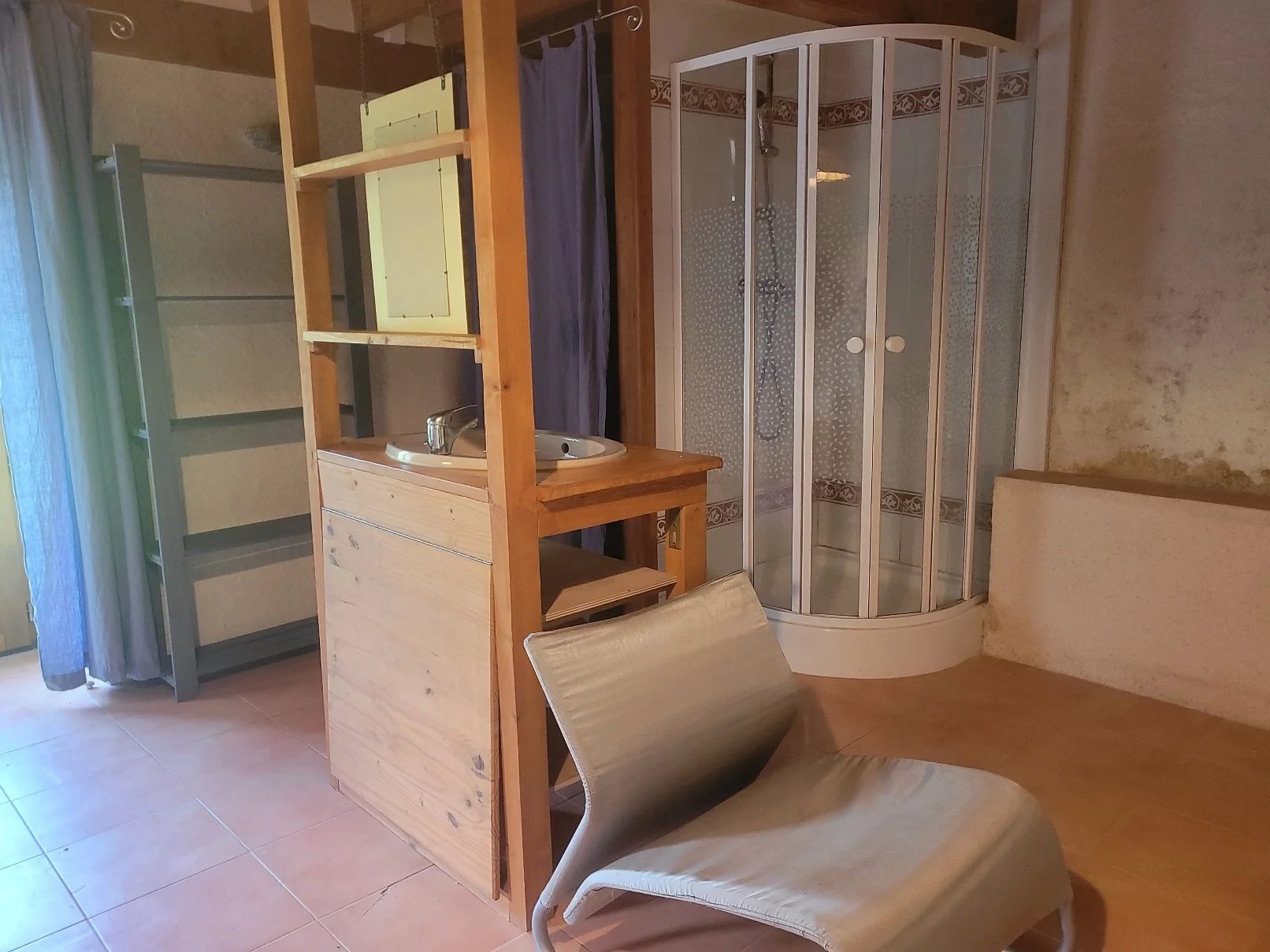 Garden level:large 21 m2 bedroom with shower, washbasin, and direct access to the terrace.