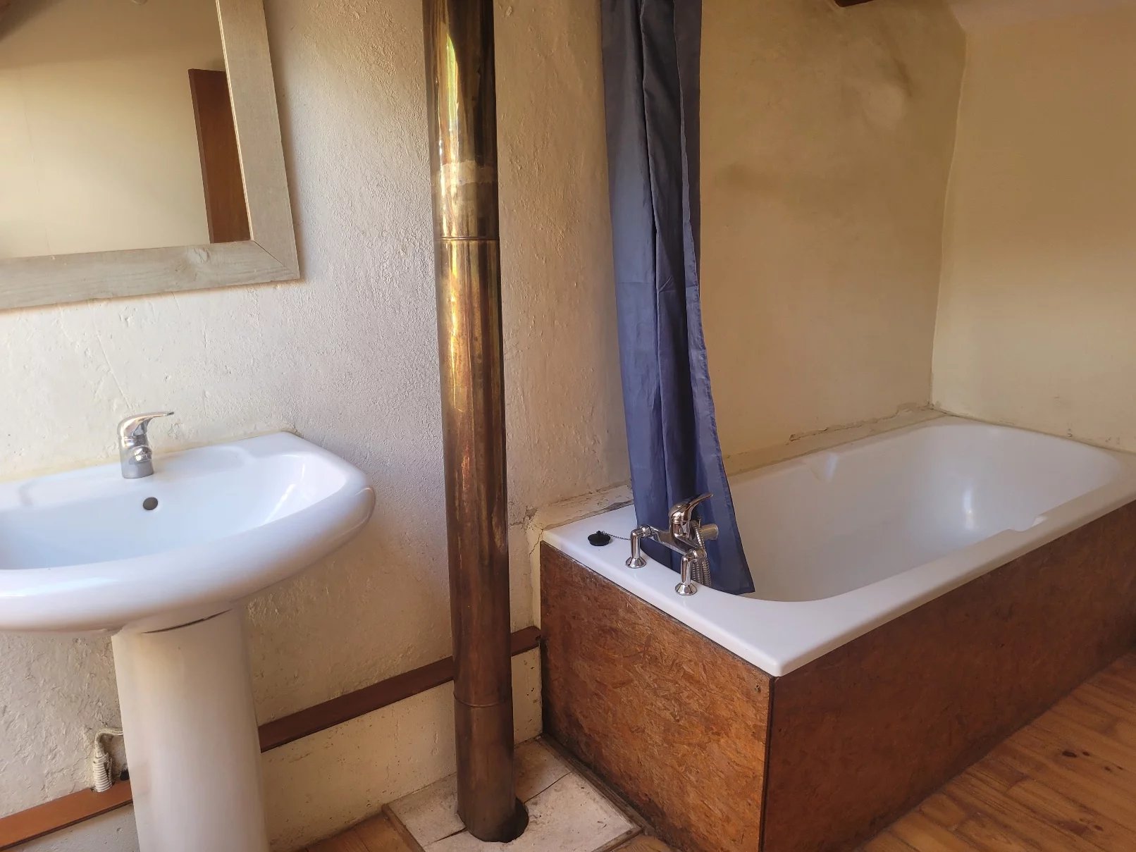 Roof with concrete tiles, electric water heater, connected to mains water.
