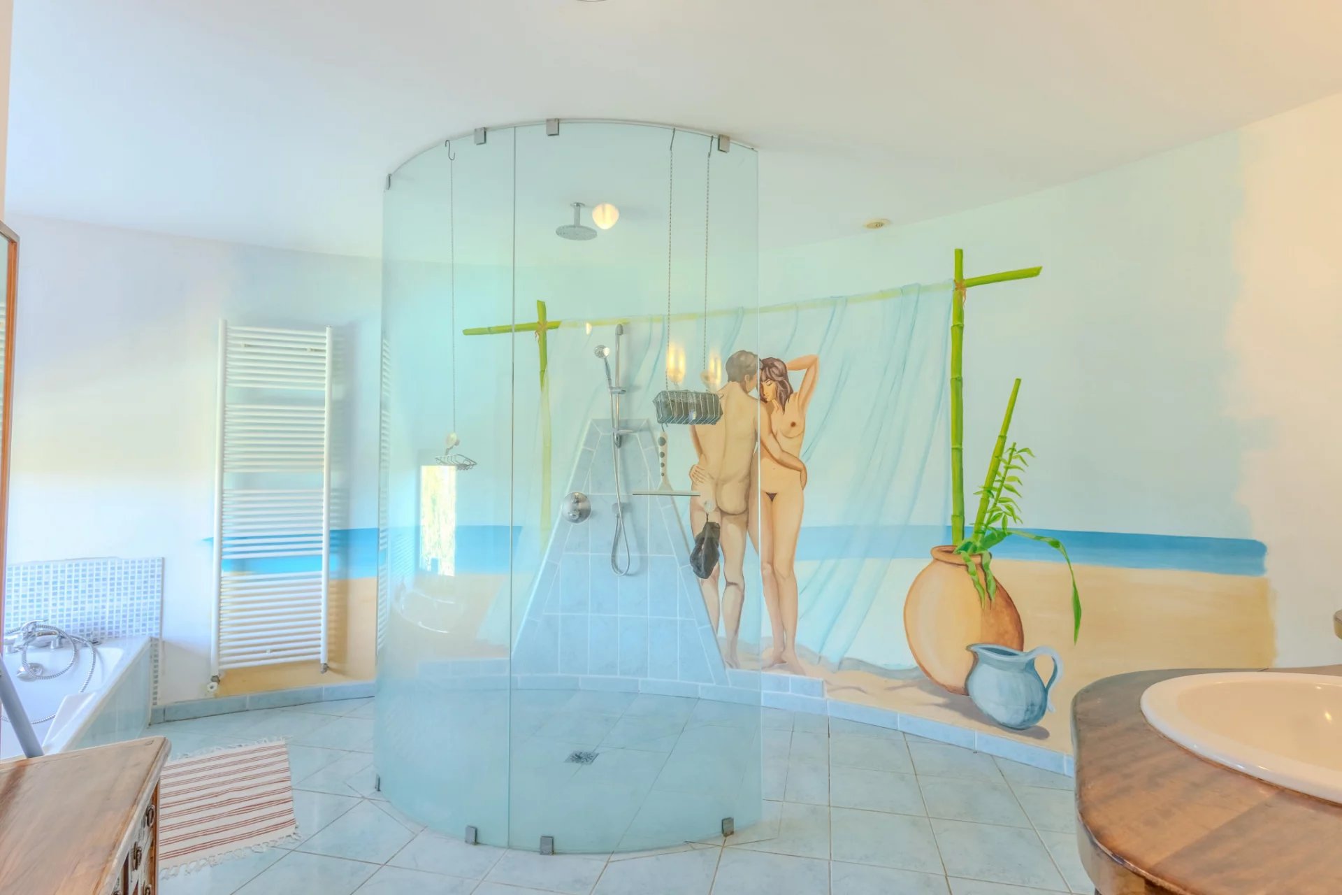 Main residence of 350 m2 offers on the ground floor: entrance, bedroom 1 with shower, boiler room, WC. Living/dining/kitchen area of 70 m2 with two large bay windows opening onto the south-facing terrace. 32 m2 living room opening onto the north-facing terrace, 27 m2 TV room.First floor: 3 large bedrooms ranging from 25 to 38 m2, each with a full bathroom.Second floor: 33 m2 bedroom with the possibility to install a shower room.