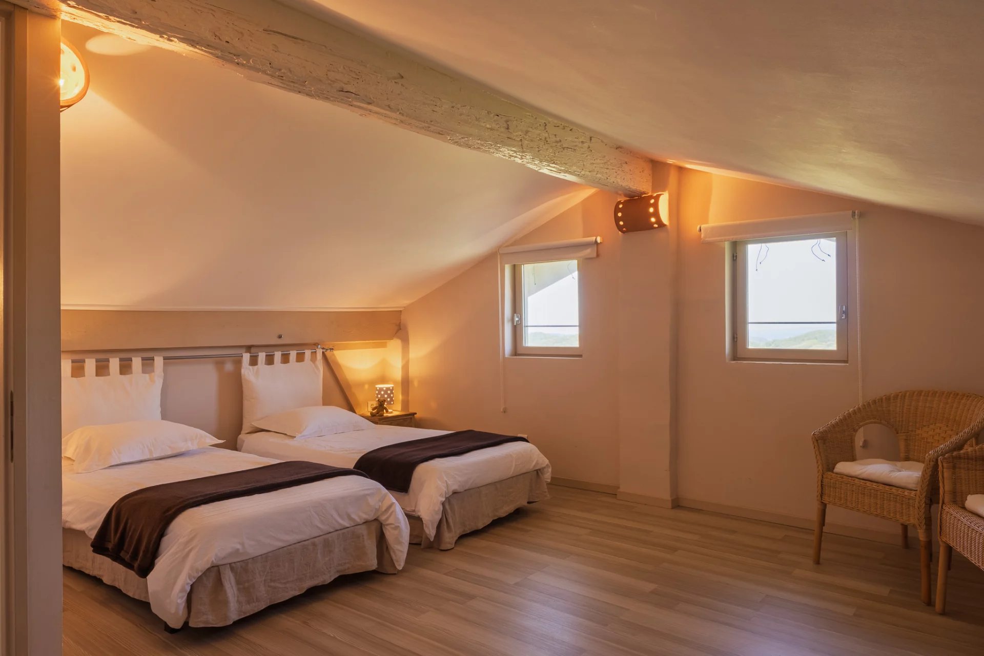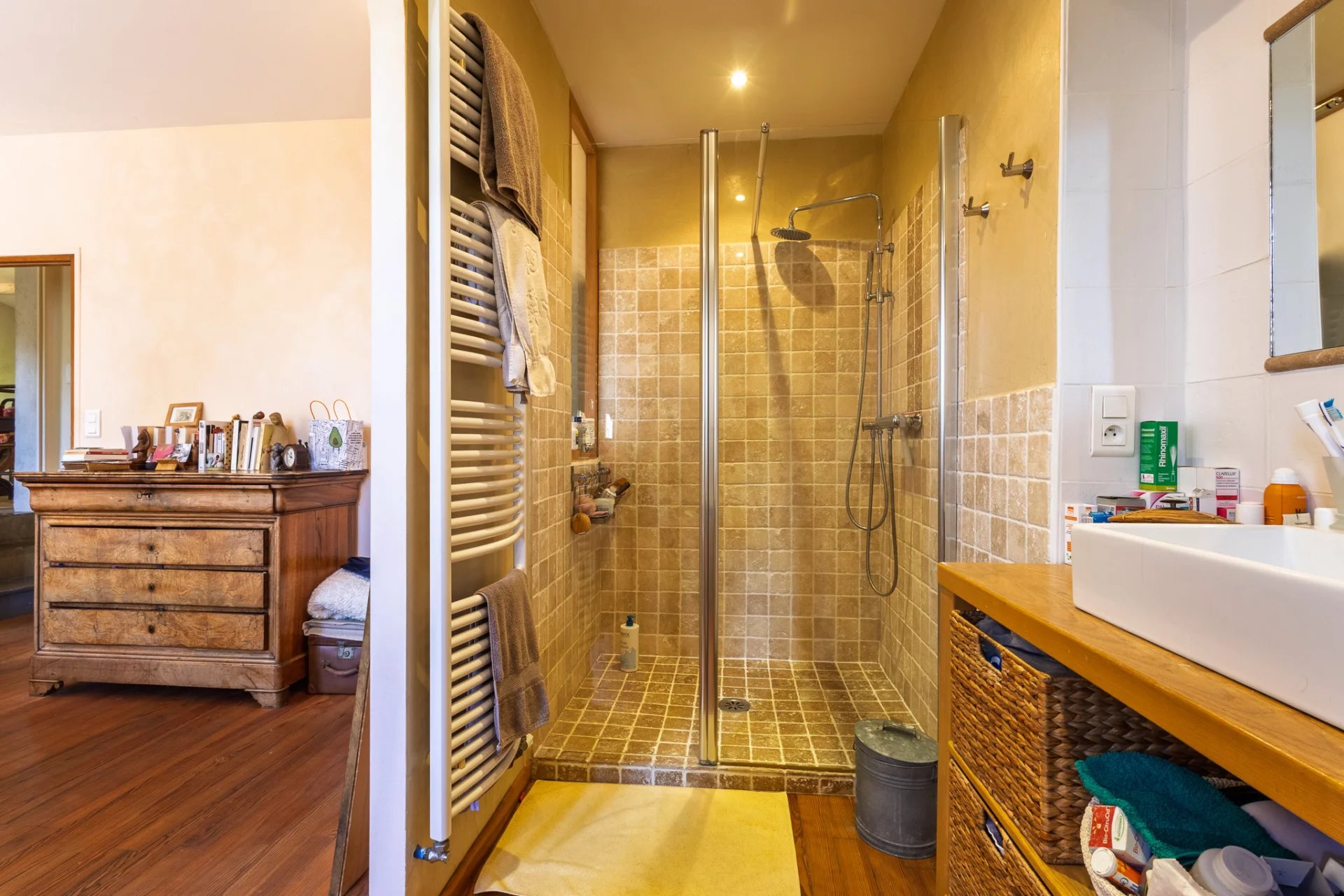 Upstairs: 3 bedrooms (one with bathroom, shower and dressing room), office, shower room, separate toilet, attic accessible by fixed staircase and convertible according to your wishes.