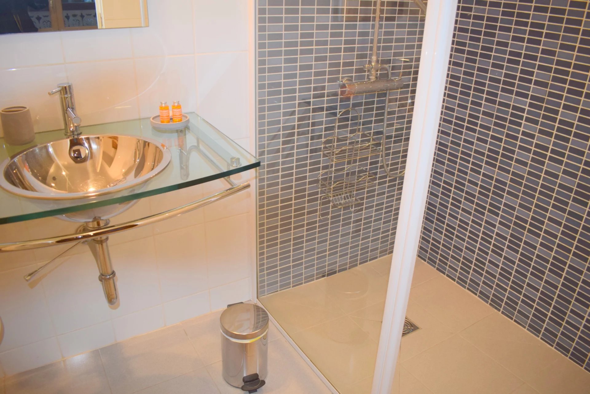 On the ground floor, a wide entrance hall leads to a bright living room, a dining room with mountain views, and a fully equipped kitchen overlooking the garden. A private bedroom with en-suite shower room completes this level.