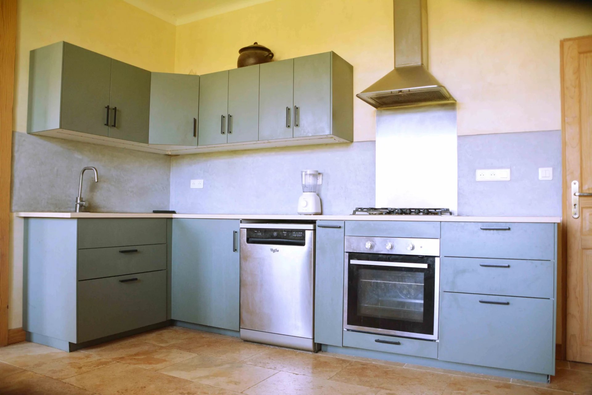 The house features a bright 40 m2 living area with fitted kitchen and access to a rockery, three to four bedrooms, a shower room with walk-in shower and separate WC.