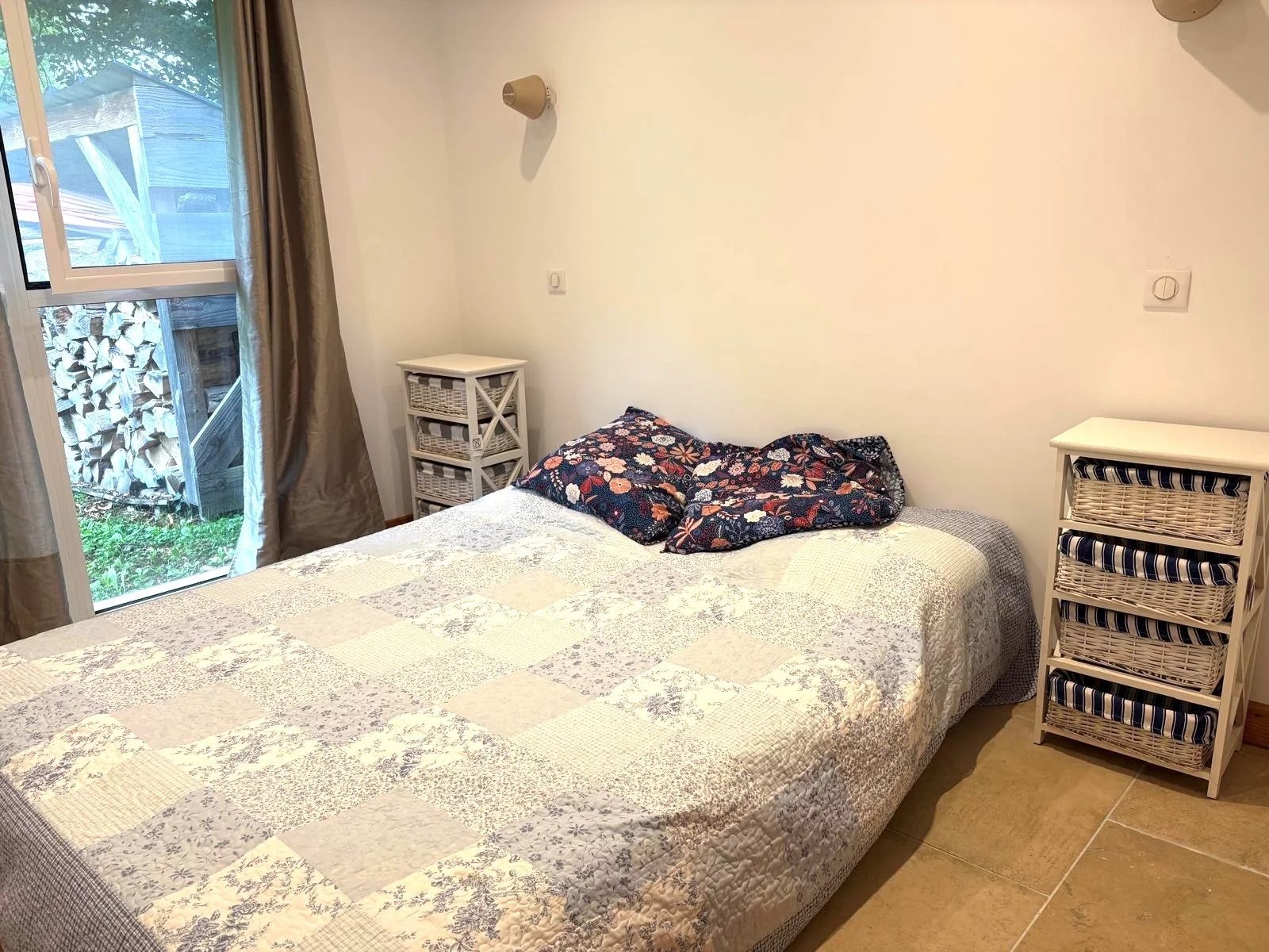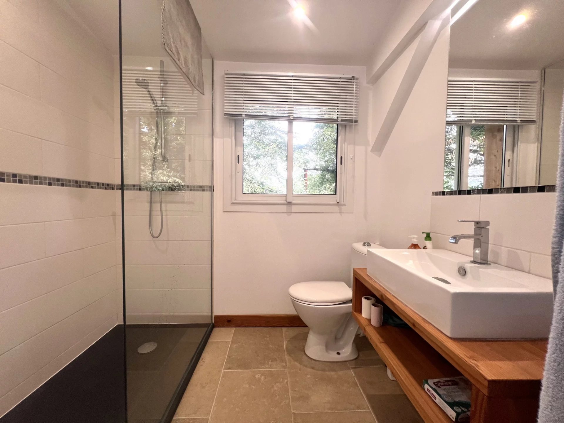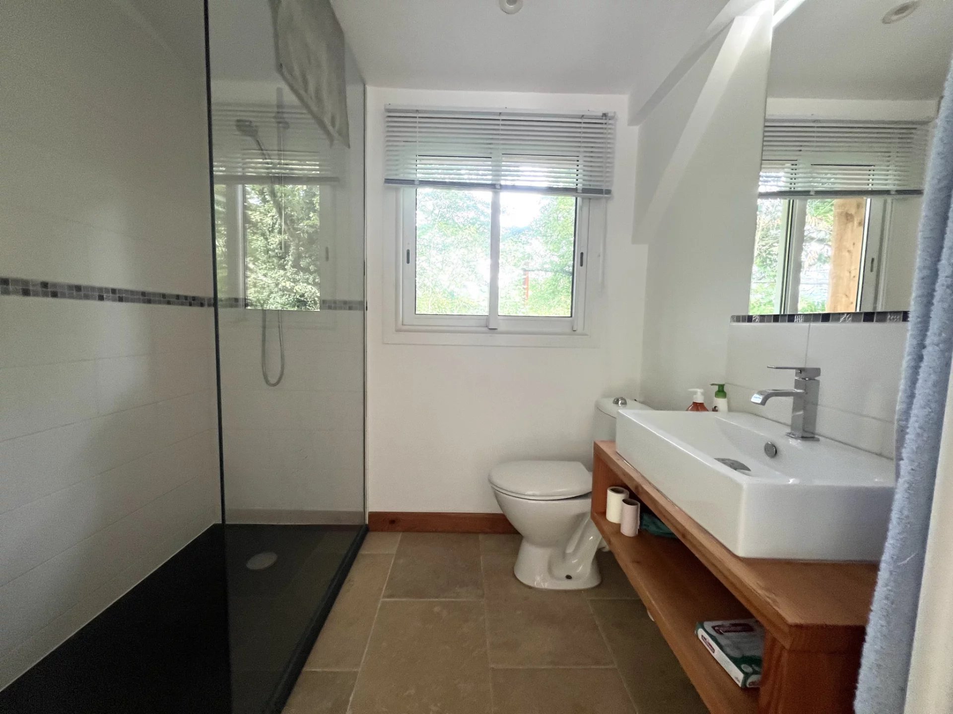 The 2-bedroom little home (86m2) welcomes you into a private paradise. The driveway leads up to the cottage, with parking for several cars. You arrive at an entrance hall with storage, opening onto a living room with a modern open-plan kitchen . Also on the ground floor, the new extension, thanks to sliding glass doors, this space offers a bright room that can be used as a living room, dining room, or a separate studio. Two sliding wooden doors reveals the modern shower room with WC and another into the guest bedroom with a private entrance from the garden, ideal for hosting guests. There is a sunny terrace which offers exterior dinning and an outlook onto the garden.