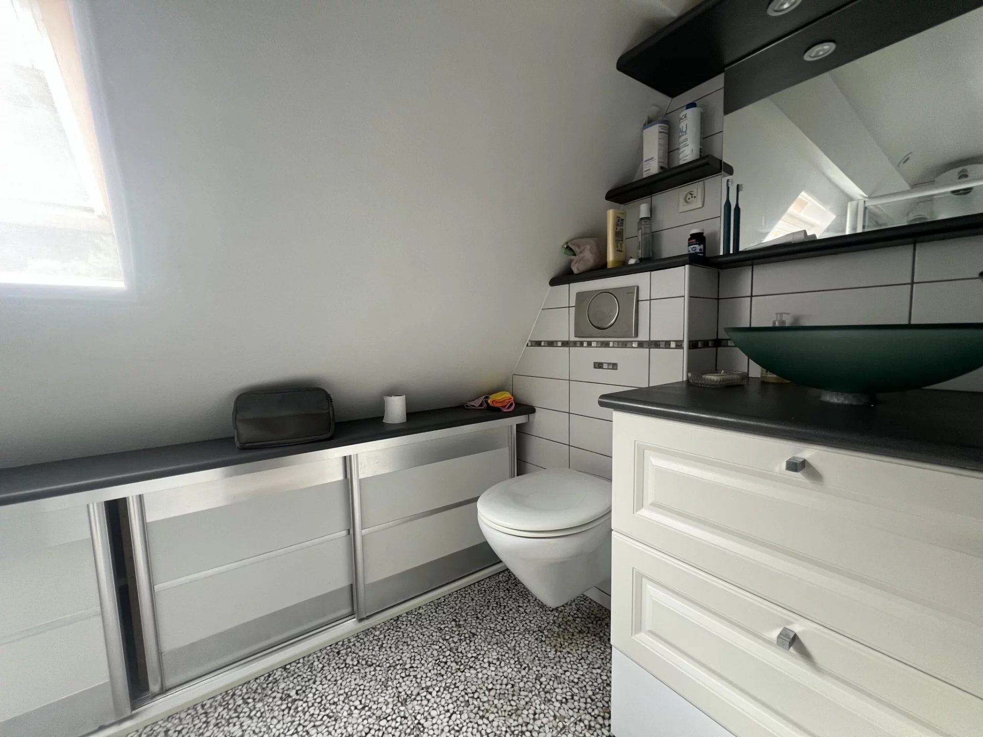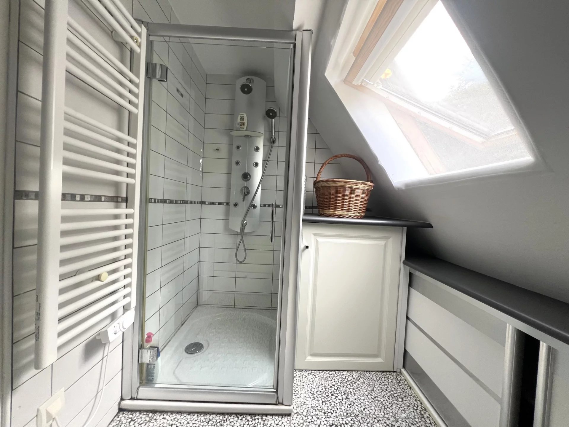 Upstairs, there is another shower room with laundry space and wc, and the master bedroom (10m2) , is bright and spacious, with double-height ceilings.