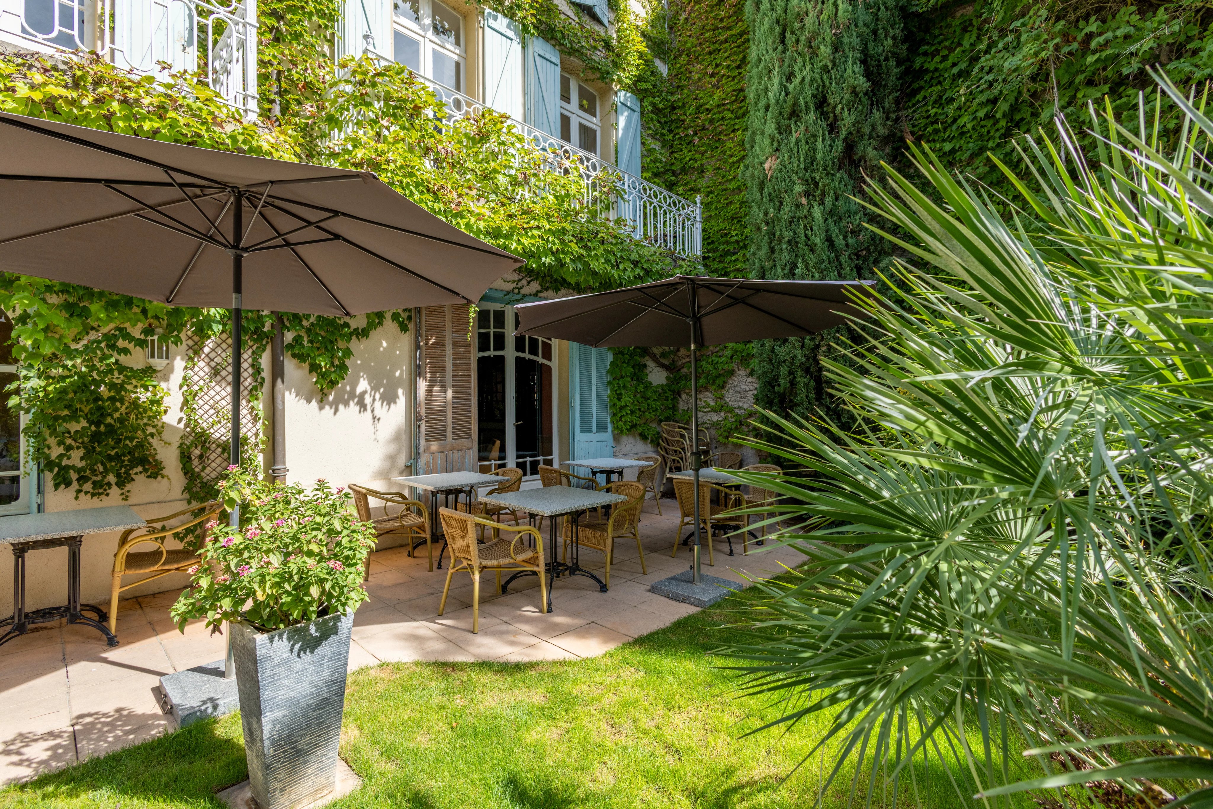 Outside, a large terrace overlooks a landscaped garden with Mediterranean plants.
