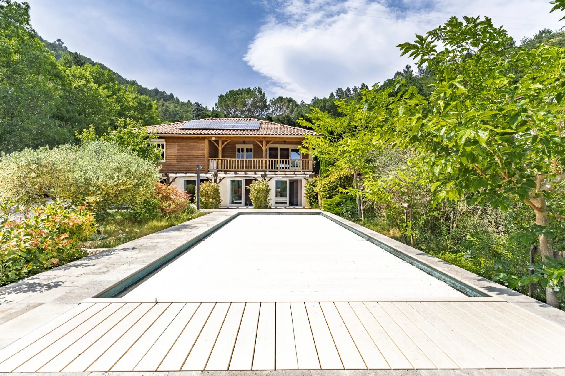 Set on the heights of Quillan, this beautiful contemporary timber-frame chalet offers a warm, bright and peaceful living environment, with exceptional views over the “3 Quilles” mountain range. Built in 2013 on a fully fenced 1,270 m² plot, it provides around 175 m² of living space, along with a saltwater pool, jacuzzi, garage and an independent wooden annex.