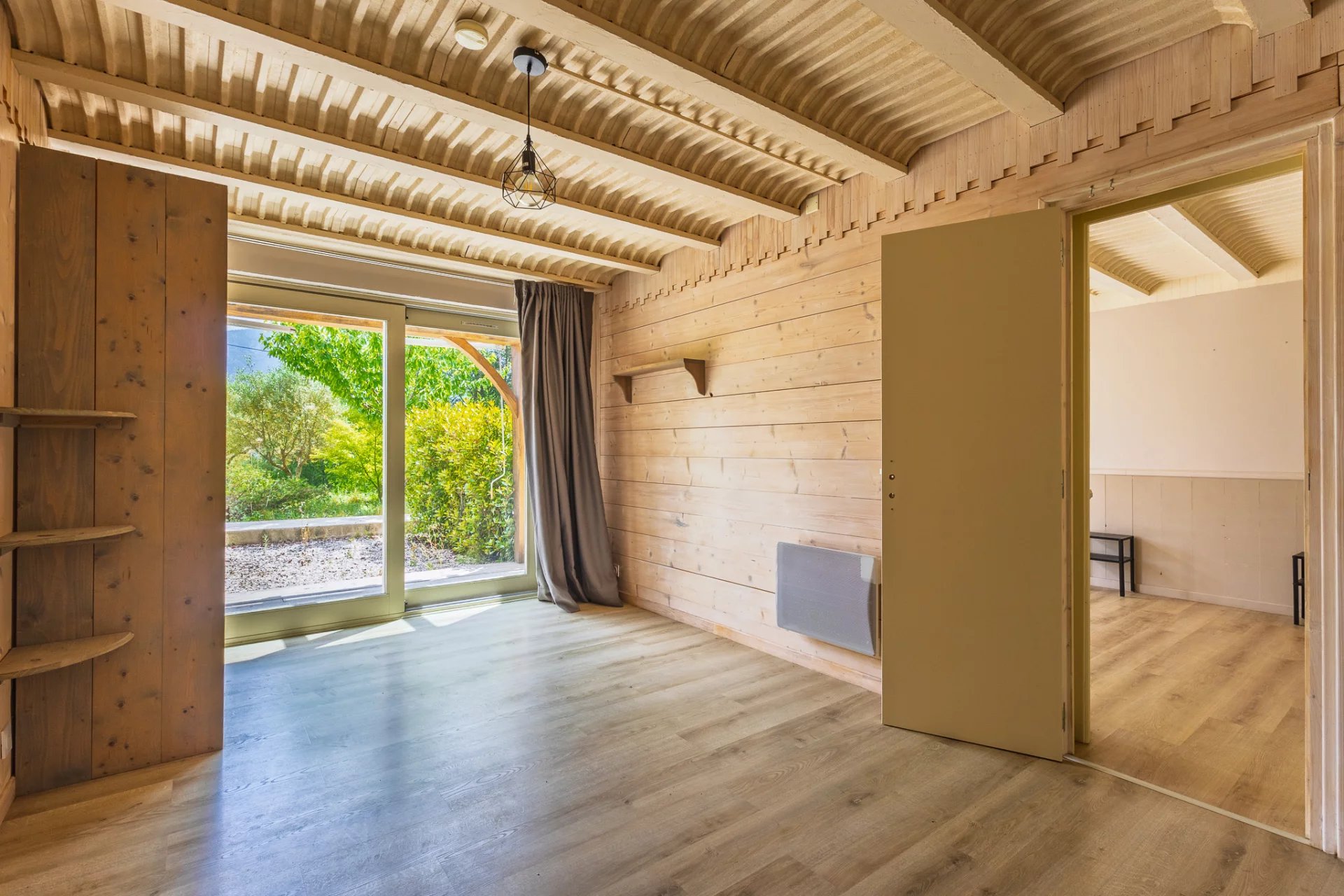 The large covered terrace opens onto a spacious 70 m² living area filled with natural light, featuring exposed beams, a fully equipped kitchen and a cosy lounge. The main level also includes a master suite with shower room, dressing/office space and direct access to the jacuzzi, as well as a second bedroom.