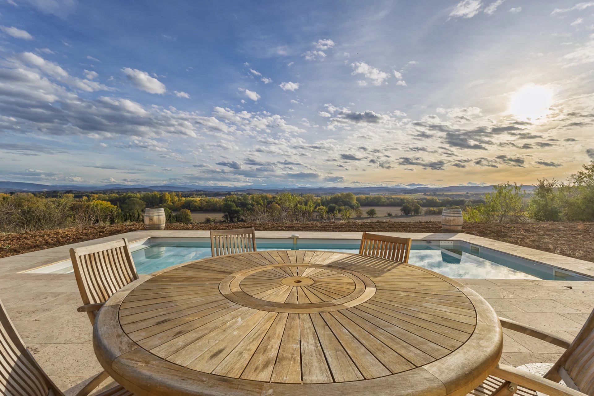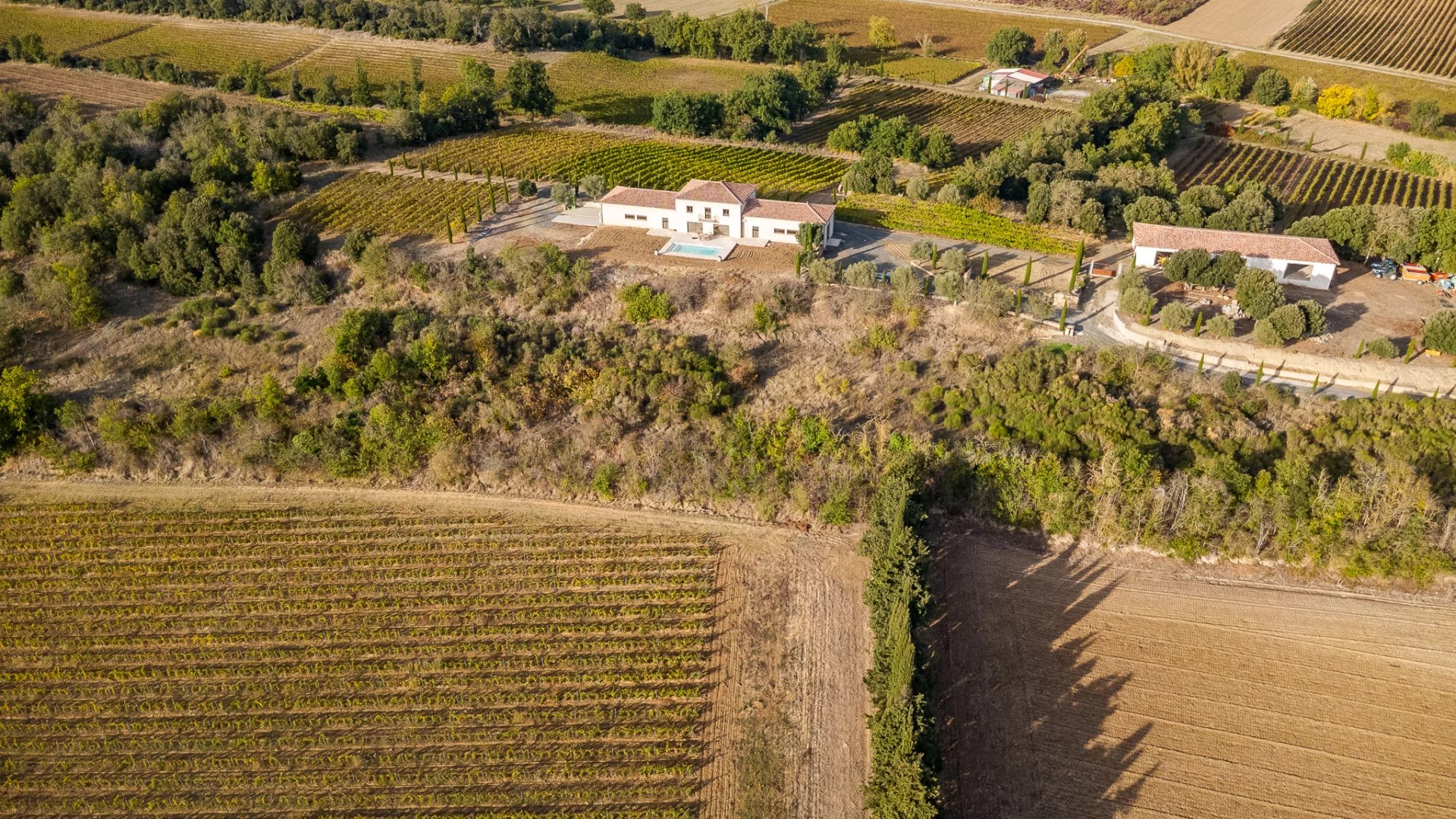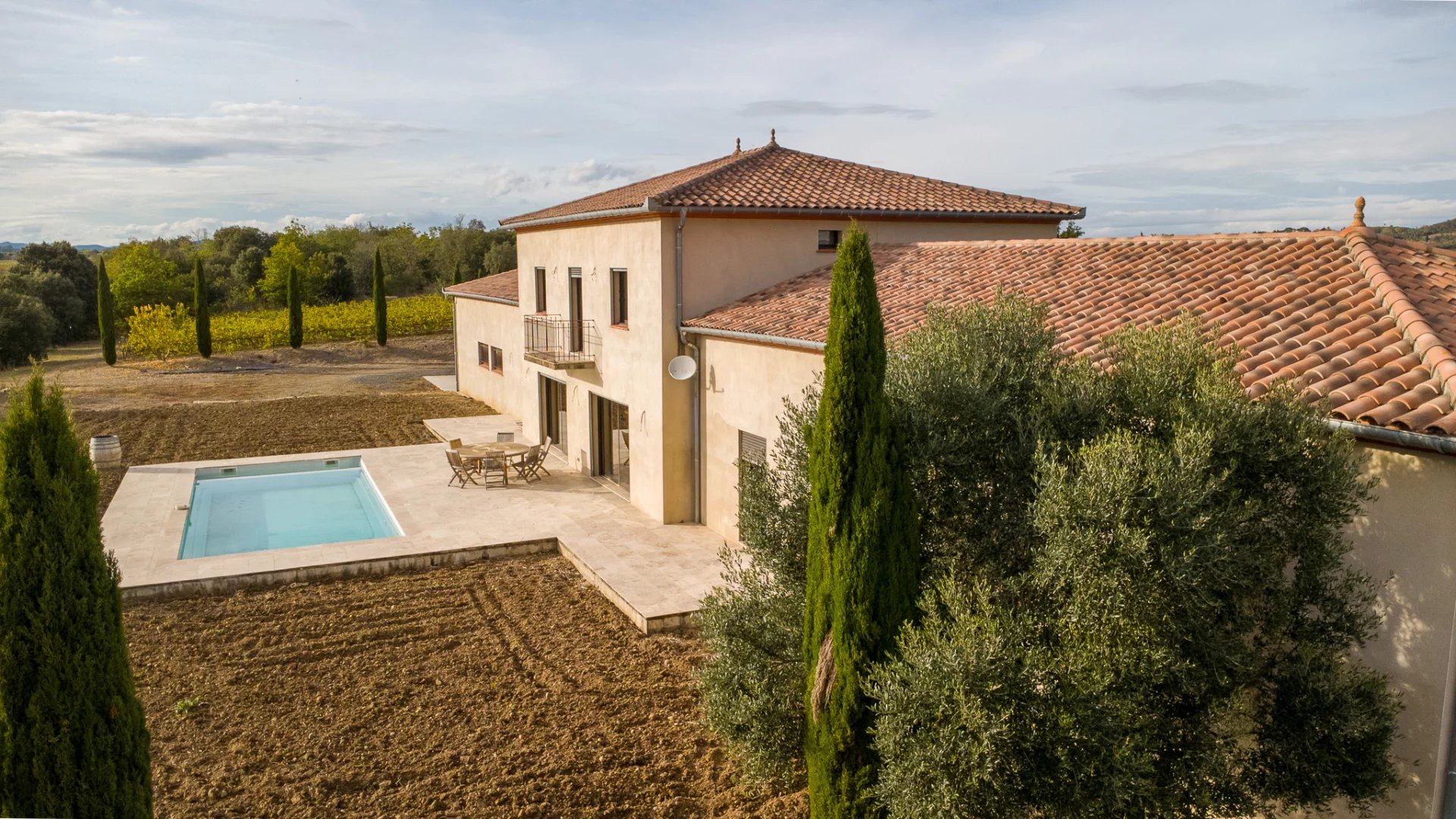 The property combines modern architecture with quality finishes and offers stunning views over the surrounding vineyards and the rolling hills of southern France.