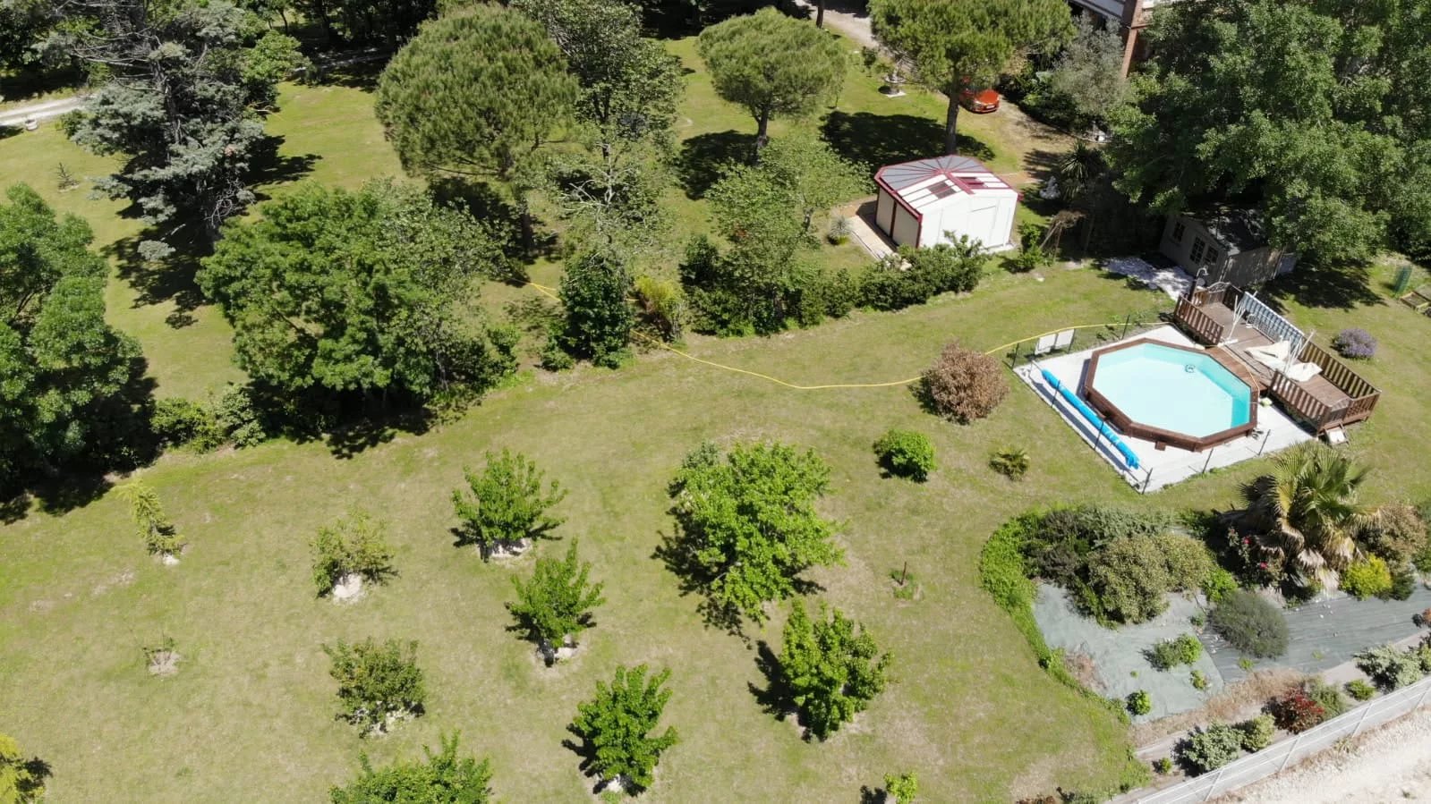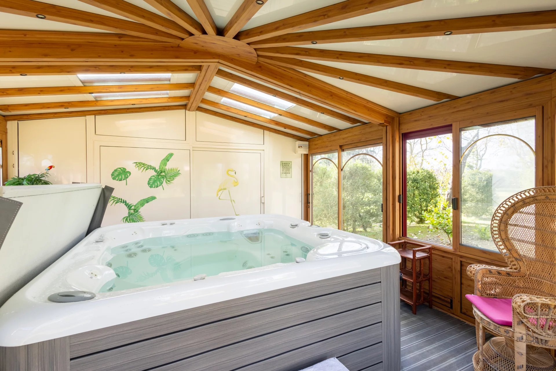 The top level features an additional cozy space: a double bedroom with a unique ambiance, a second bedroom, and a shower room. The grounds offer outdoor spaces designed for conviviality and relaxation, including a generous orchard (apricots, plums, cherries, etc.), an above-ground pool with a wooden deck, and a wellness area with a high-end spa usable all year round.