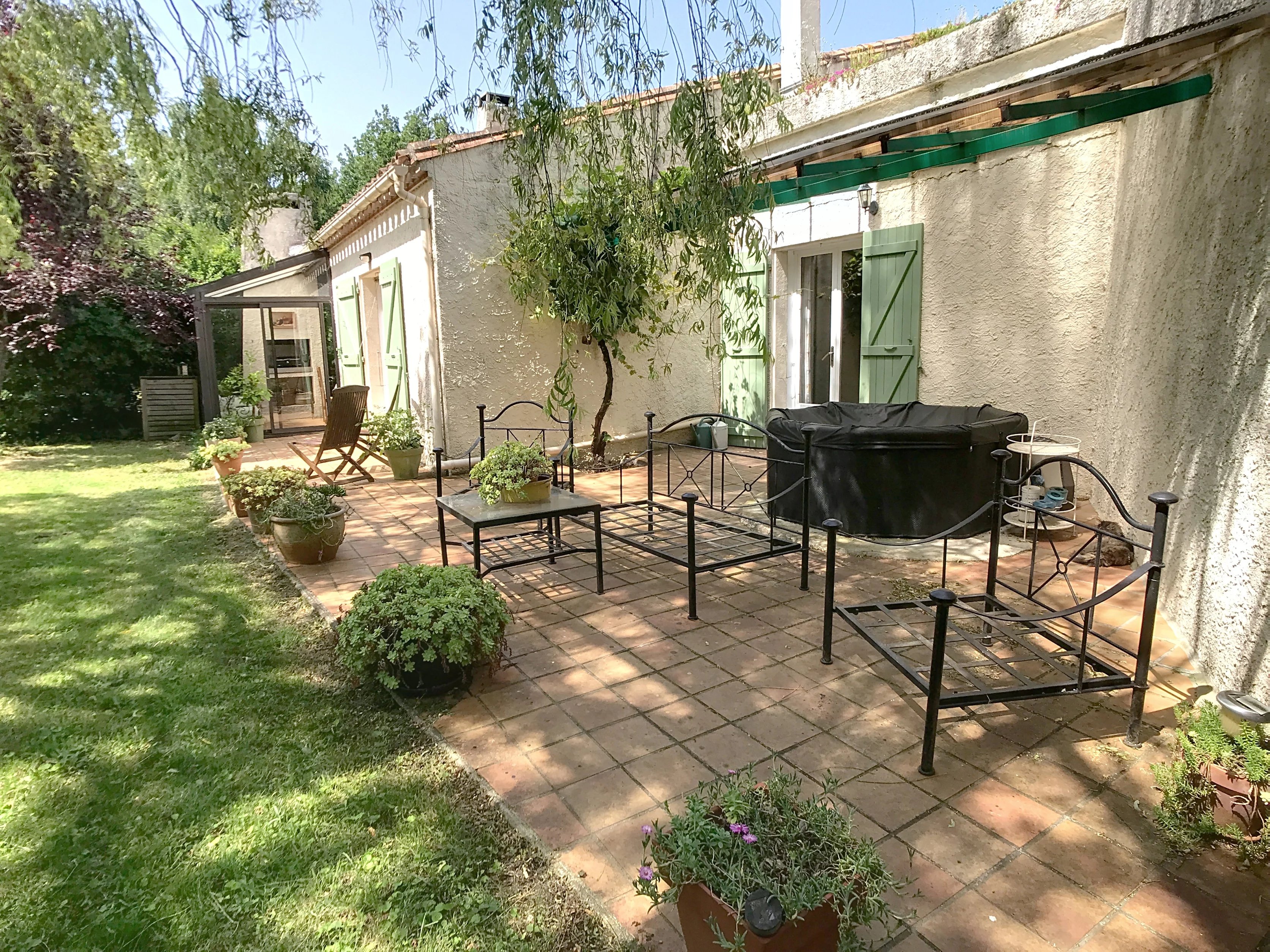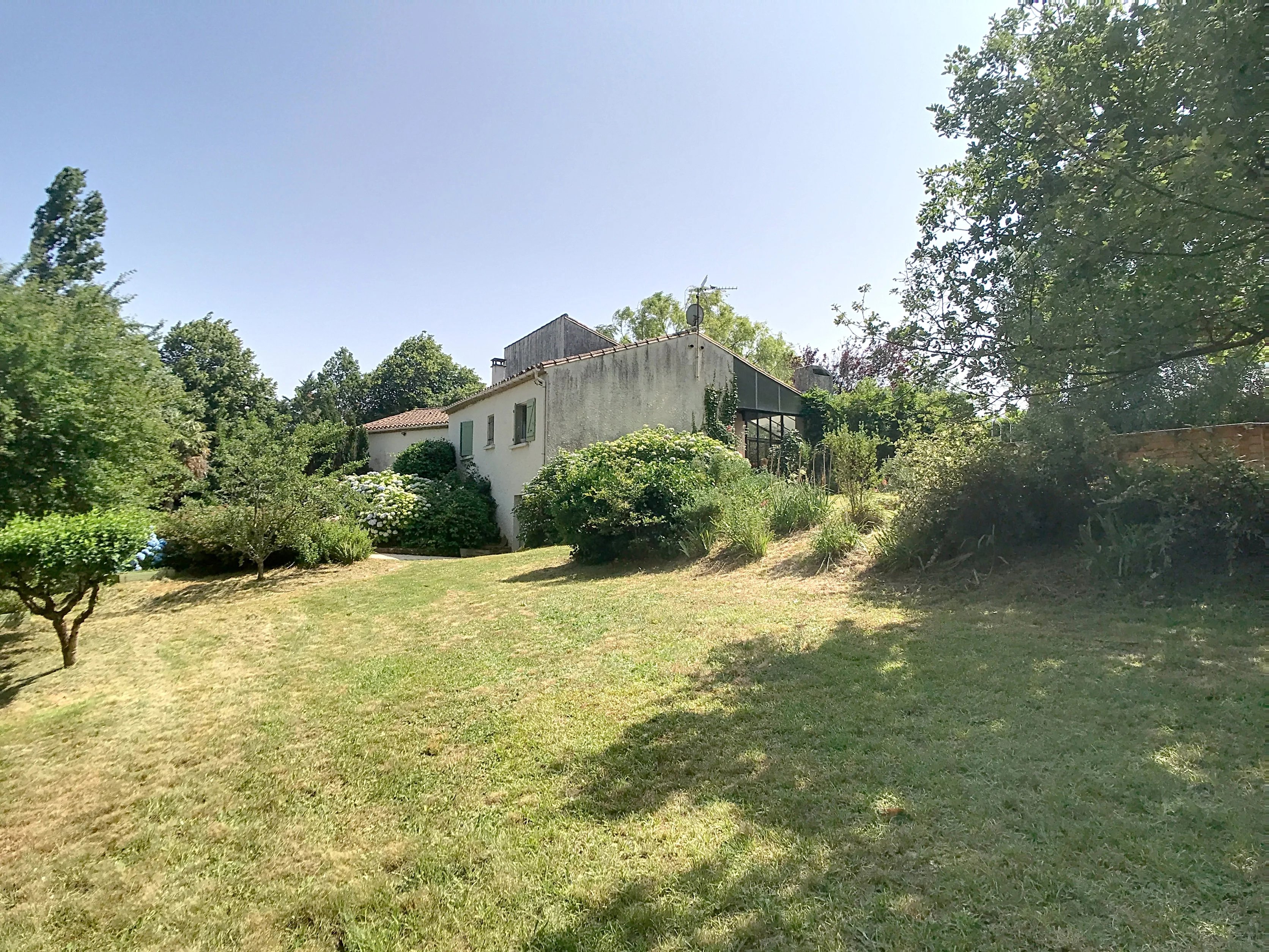 Outside, the landscaped grounds, dotted with hydrangeas, invite you to relax. An above-ground swimming pool completes the space, ideal for enjoying fine weather out of sight.
