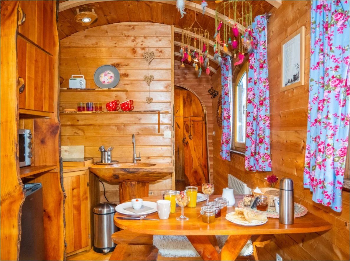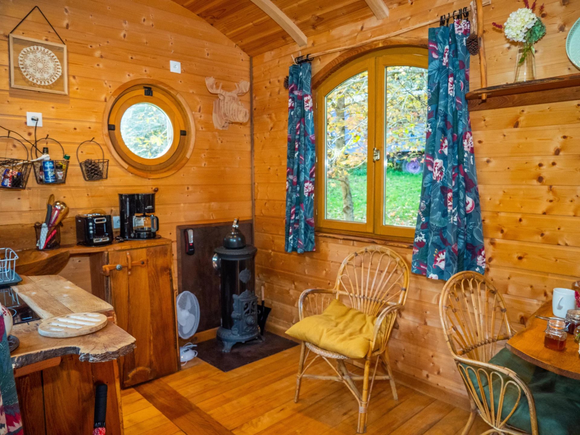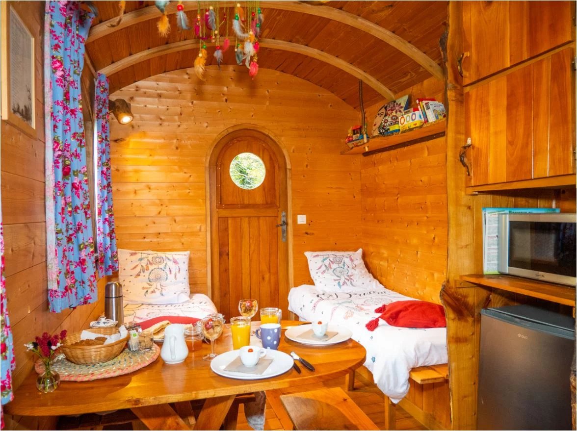 De twee woonwagens zijn comfortabel en smaakvol ingericht, volledig gemaakt van hout (een dozijn verschillende soorten), zowel binnen als buiten, inclusief het meubilair en de wastafels. Ze kijken uit op de Moulin in de bloemrijke weide, waarbij de privacy van de gasten gewaarborgd blijft.