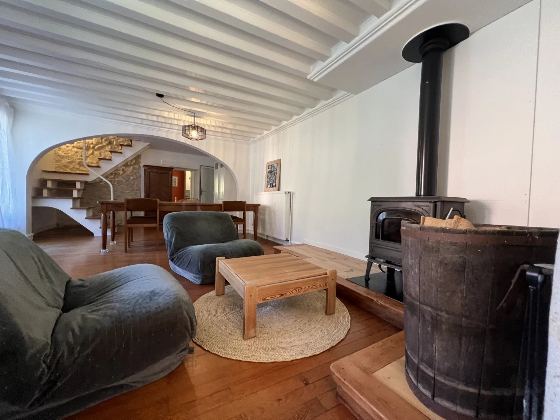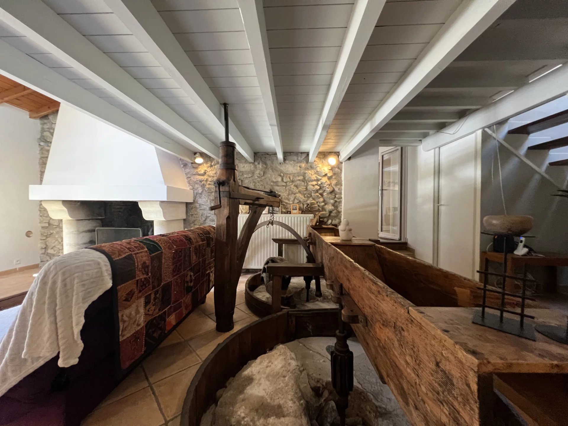 Je komt binnen in een kamer die dienst doet als ontvangstruimte voor gasten, maar ook kan worden gebruikt als hal (garderobe en voorraadkamer). Vervolgens kom je in een volledig uitgeruste keuken. Vanaf hier is de belangrijkste woon/eetkamer met zijn houtkachel, witgekalkte muren en ramen die uitkijken op het 30 vierkante meter grote zonneterras. Aan het einde vind je nog een kamer die momenteel wordt gebruikt als kleine tv/leeskamer, maar die ook een slaapkamer zou kunnen zijn, met uitzicht over de rivier en de groene omgeving. De ‘molensteenzaal’, met zijn oude apparatuur, is nog steeds intact en biedt een fantastische zitkamer die uitkomt op een overdekt terras met uitzicht op de rivier. Er is ook een rotstuin/mezzanine voor kinderen en tieners met boeken en spelletjes (of een kantoorruimte met op maat gemaakte rekken)Op de bovenverdieping zijn er twee slaapkamers (met kleedkamer en grote, volledig gerenoveerde kledingkast), een badkamer (met bad en 2 wastafels) en een zonnige mezzanine (ontspannings-/sportruimte met uitzicht op de rivier).