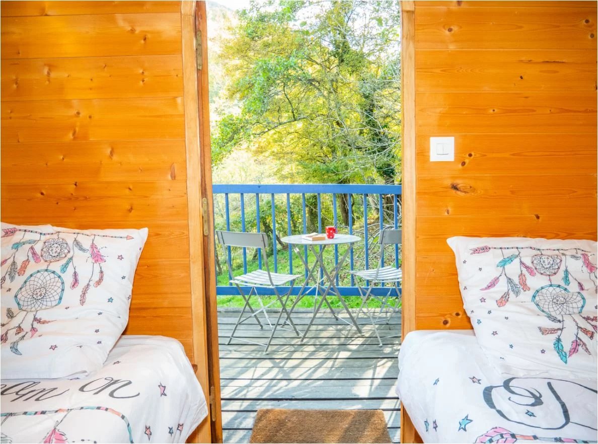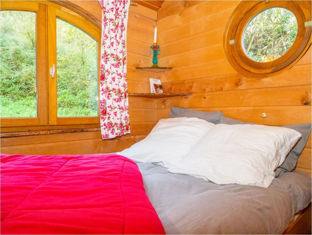 Deze kleine huisjes op wielen bieden momenten van rust en sereniteit in een bucolische, landelijke omgeving, waar je je batterijen kunt opladen en je zintuigen de vrije loop kunt laten.De kleinste caravan heeft 2 slaapplaatsen, een houten terras met uitzicht op de bergen en een boomgaard met appel-, peren-, vijgen-, walnoot-, mirabel- en kiwibomen. Er is een comfortabele slaapkamer in een houten alkoof, met een bed voor 2 personen (een onderschuifbed is beschikbaar in de woonkamer). Alles wat je nodig hebt om te koken, kookplaat, koelkast, magnetron, broodrooster, waterkoker, koffiezetapparaat en barbecue. Aparte badkamer met douche, houten wastafel en toilet. De caravan is geïsoleerd en verwarmd (elektrische radiatoren en kleine houtkachel) en heeft een ontspanningsruimte met ligstoelen en parasol.