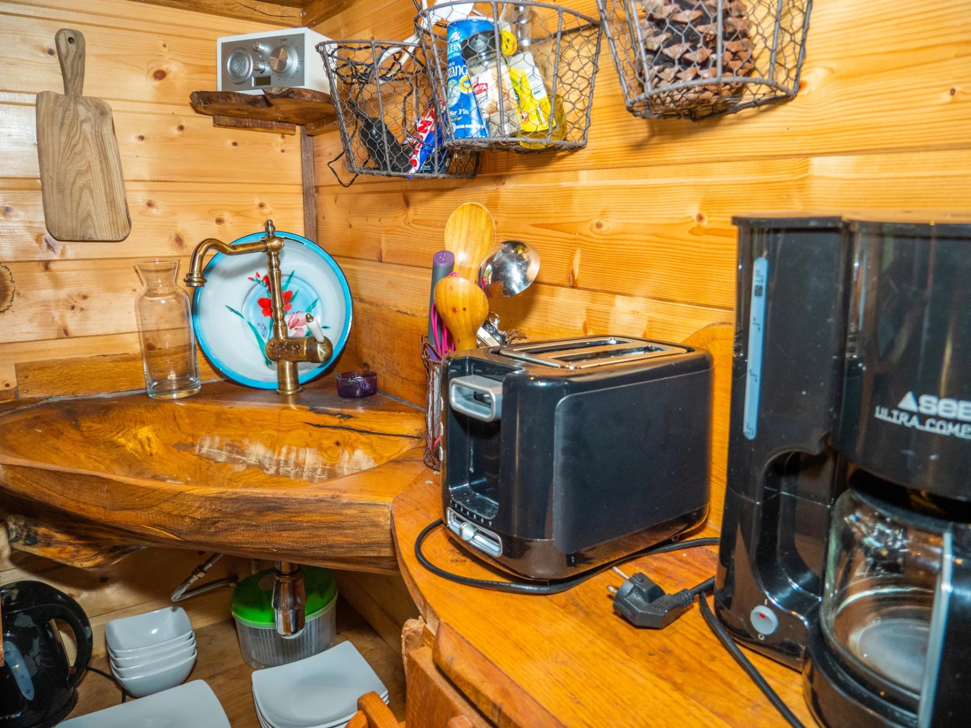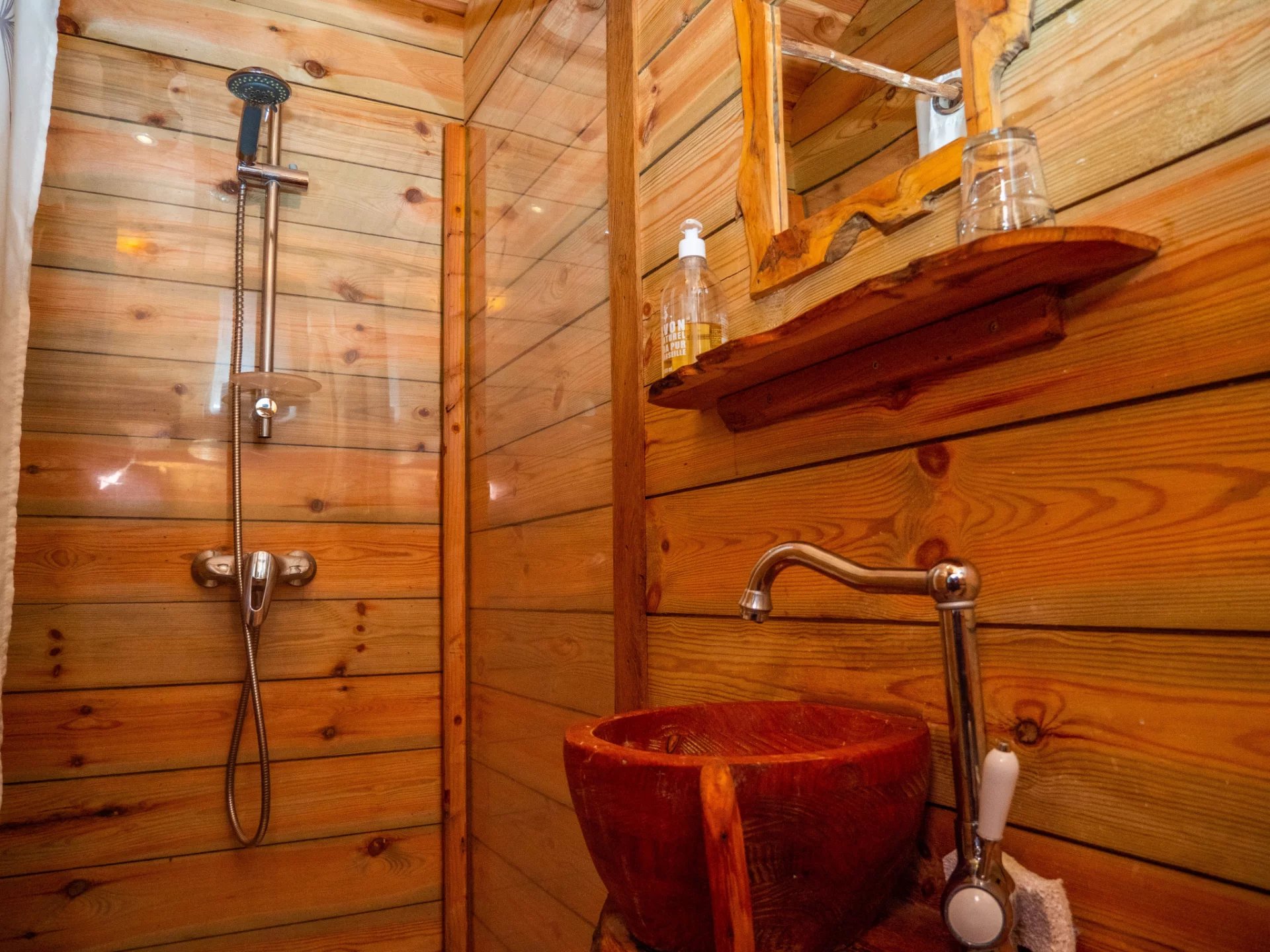 De grootste caravan is geschikt voor maximaal 4 personen (2 volwassenen en 2 kinderen). Gasten kunnen ontspannen op het houten terras met een prachtig uitzicht op de bergen. De comfortabele houten slaapkamer heeft een tweepersoonsbed. Twee bankjes (70x180 cm) bieden plaats aan 2 kinderen in de woonkamer. De badkamer heeft een aparte douche, houten wastafel en toilet. De caravan is ook geïsoleerd en verwarmd (elektrische radiatoren). Hij is uitgerust met een kookplaat, koelkast, magnetron, barbecue, ligstoelen, parasol en hangmat voor toekomstige gasten.